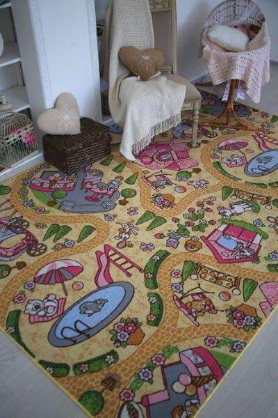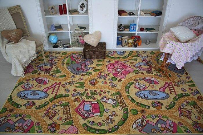 Такой коврик можно постелить в центре детской комнаты или оформить с его помощью целую игровую зону. Переживать за комфорт и безопасность ребенка не стоит. В основании паласа имеется специальная подложка из войлока, которая помогает: